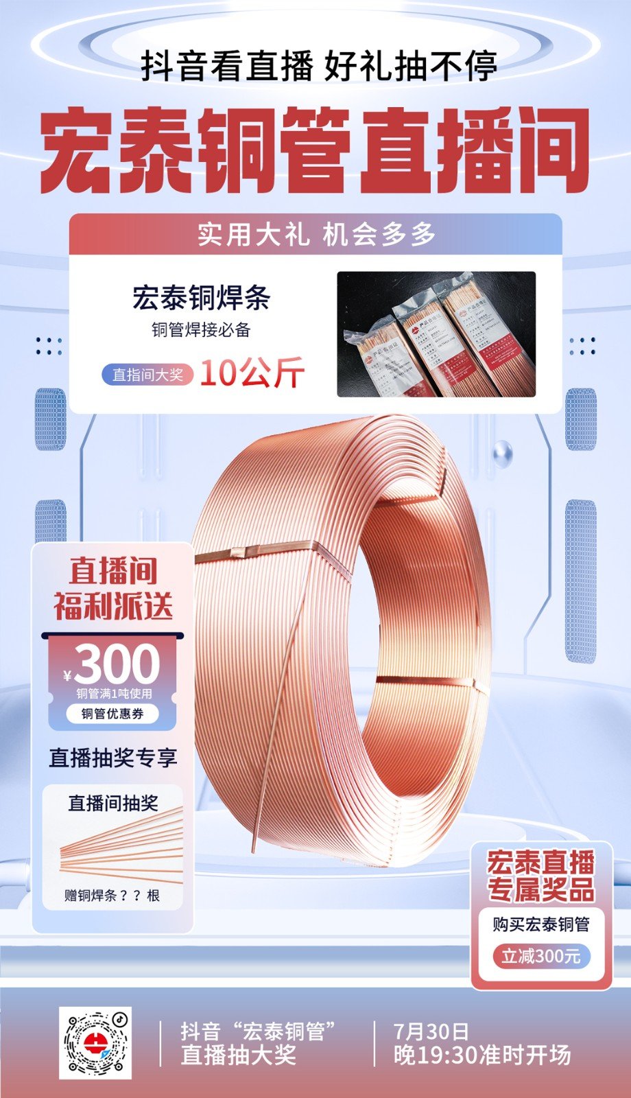 每周五晚19:30,宏泰銅管準(zhǔn)時(shí)開啟直播,全程不定時(shí)抽獎(jiǎng),我們?yōu)榇蠹覝?zhǔn)備了豐富的獎(jiǎng)品,還有驚喜大獎(jiǎng)——10公斤銅焊條和300元銅管優(yōu)惠券等好禮等您來(lái)拿!呼朋喚友一起來(lái),中獎(jiǎng)幾率翻倍哦!掃描上圖二維碼預(yù)約~我們直播見(jiàn)!