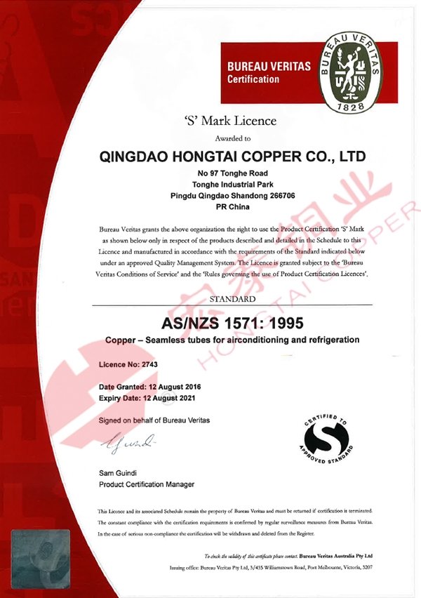 近日宏泰接到國際知名認(rèn)證機(jī)構(gòu)必維國際檢驗集團(tuán)(Bureau Veritas)通知,宏泰銅管產(chǎn)品再次通過NZS 3501水汽衛(wèi)生用銅管標(biāo)準(zhǔn)認(rèn)證【證書編號:2742】、AS/NZS 1571無縫制冷用銅管標(biāo)準(zhǔn)認(rèn)證【證書編號:2743】和AS 1432 給排水銅管標(biāo)準(zhǔn)認(rèn)證【證書編號:23264】。此三項認(rèn)證是宏泰在2004年首次通過上述認(rèn)證后與標(biāo)準(zhǔn)體系的同步更新認(rèn)證。