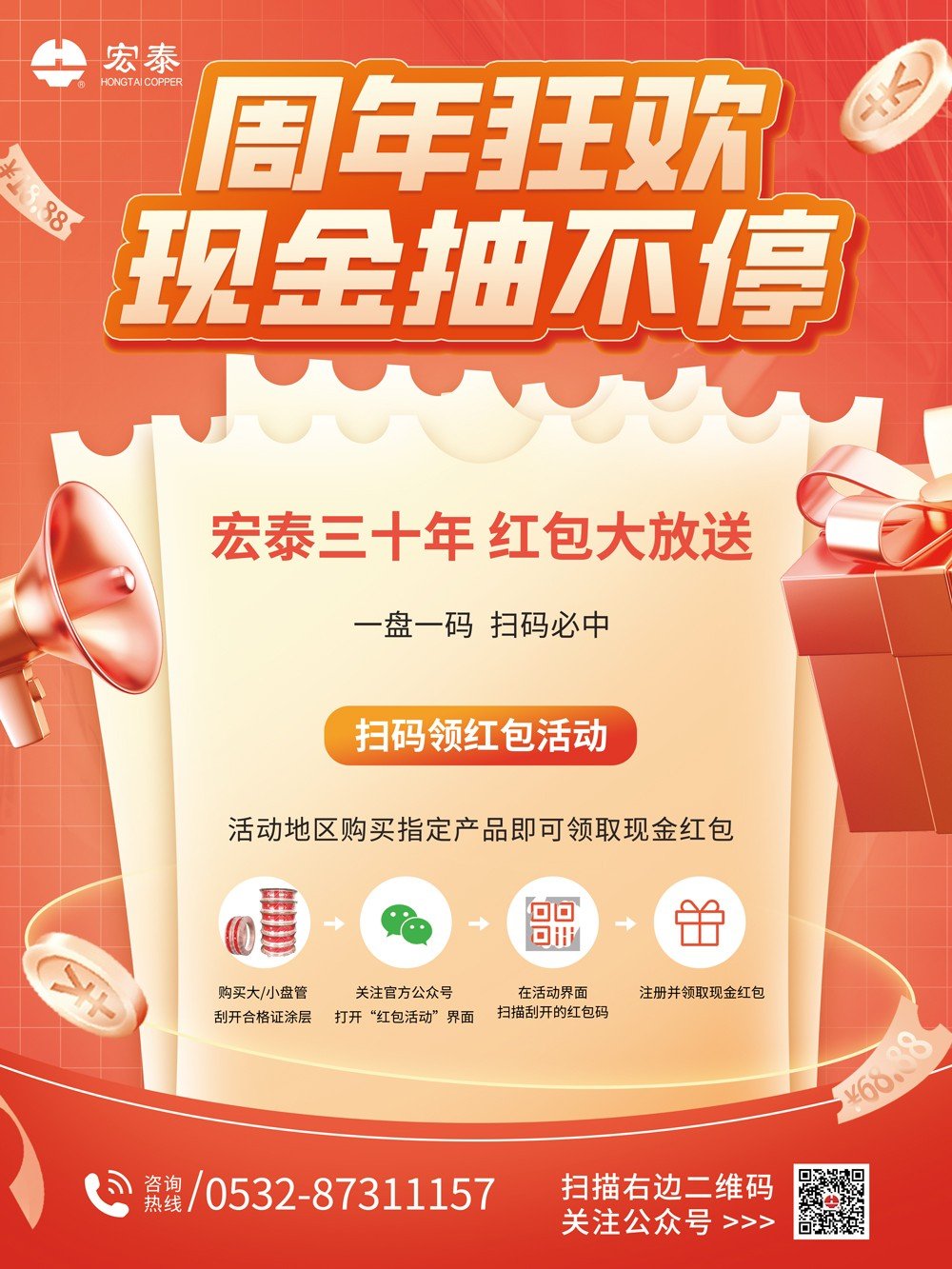 2023年,宏泰30歲。在這具有重大意義的時(shí)刻,公司經(jīng)過前期的技術(shù)研發(fā),決定在宏泰30年來臨之際,推出感恩客戶的又一具體活動——掃碼領(lǐng)紅包。凡是宏泰銅管的終端用戶,購買宏泰銅管后,通過手機(jī)掃碼,均可領(lǐng)取金額不等的紅包。公司通過這一活動,力促進(jìn)一步粘合與客戶緊密度,真正做到回饋終端客戶。通過掃碼領(lǐng)紅包活動,讓客戶真切感受到公司在回饋客戶方面的熱情。為了真正做到回饋終端客戶,參與該活動的,僅限宏泰銅管的終端客戶,經(jīng)銷商不參與該活動。讓利終端客戶(非中間商),這在宏泰歷史上是首次,是一次全新的嘗試,公司后期會推出更多的感恩客戶的具體活動,敬請期待。