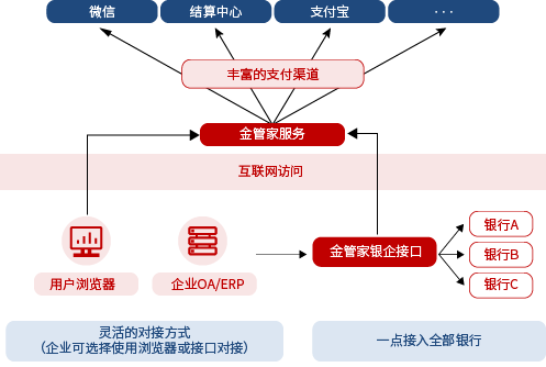 企業(yè)可以根據(jù)實際需求通過WEB方式或通過API方式接入。通過WEB接入方式,企業(yè)只需要使用普通辦公電腦或平板電腦即可接入使用。通過API方式接入方式,企業(yè)可以實現(xiàn)ERP、財務(wù)系統(tǒng)直接對接金管家系統(tǒng)獲取賬戶數(shù)據(jù)及下達(dá)交易指令。